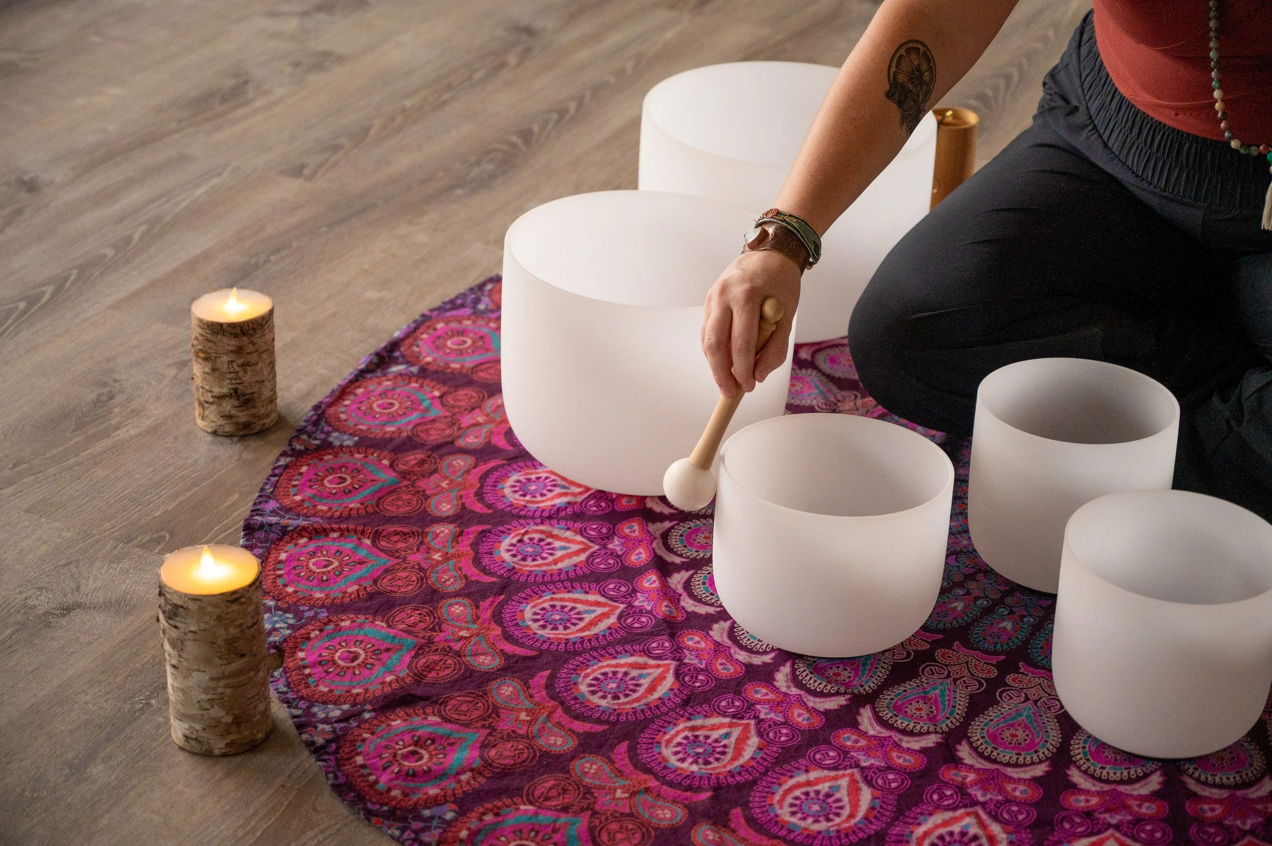 Sound frequencies help slow down the brain and get the body to a more relaxed state. Sound healing triggers a relaxation response where we can combat chronic fatigue, stress, racing mind and more.